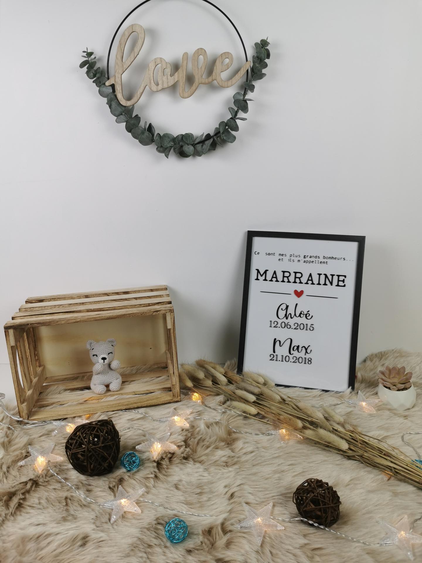 Notre cadre MAMAN est personnalisé avec le ou les prénom(s) du ou des filleul(s) ainsi que de leur date de naissance. Il vous suffira de transmettre les informations dans les encadrés en dessous.