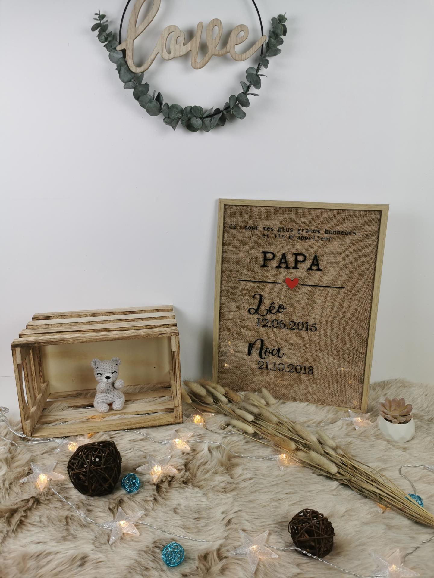 Notre cadre PAPA est personnalisé avec le ou les prénom(s) du ou des enfant(s) ainsi que de leur date de naissance. Il vous suffira de transmettre les informations dans les encadrés en dessous.