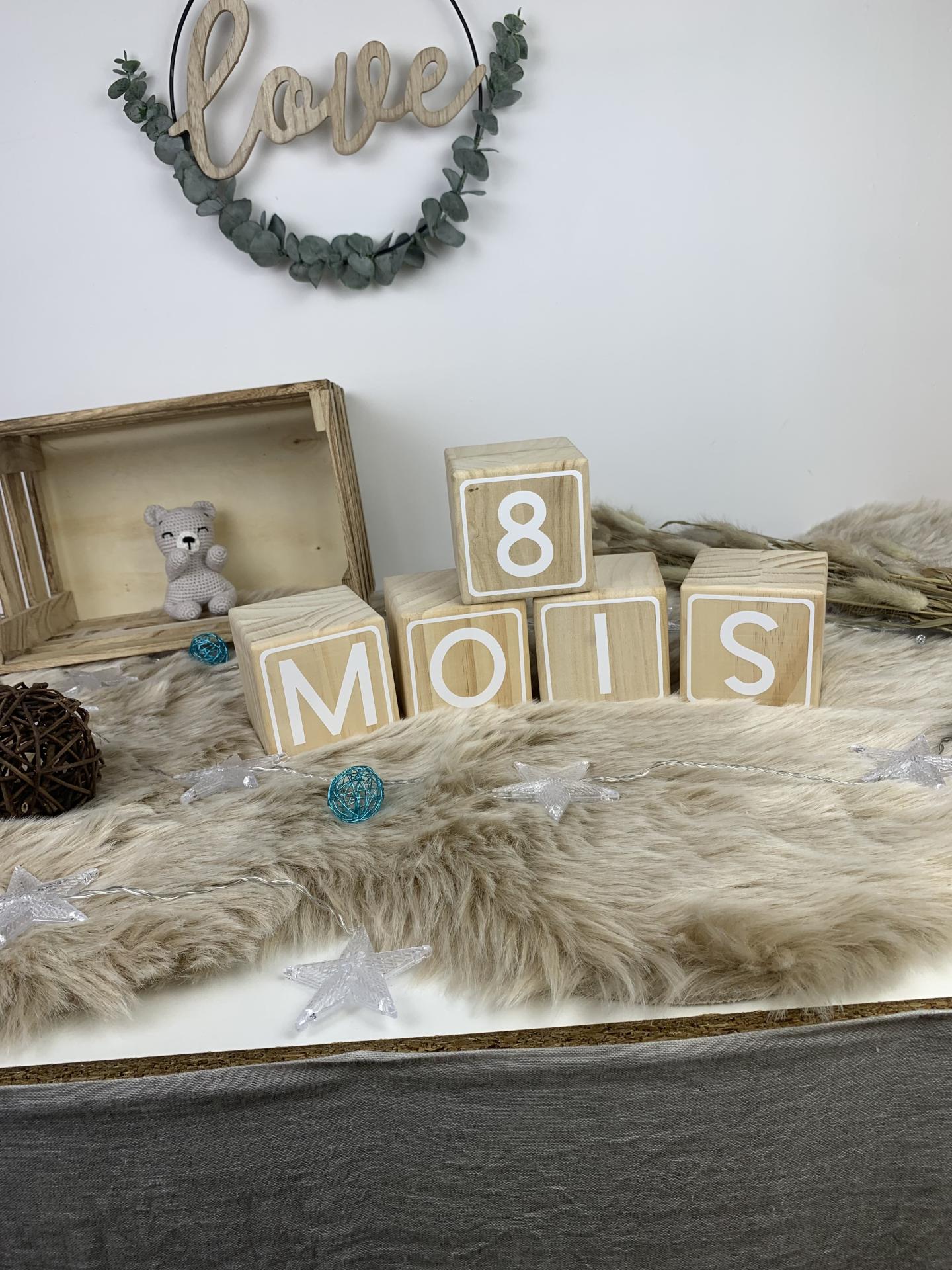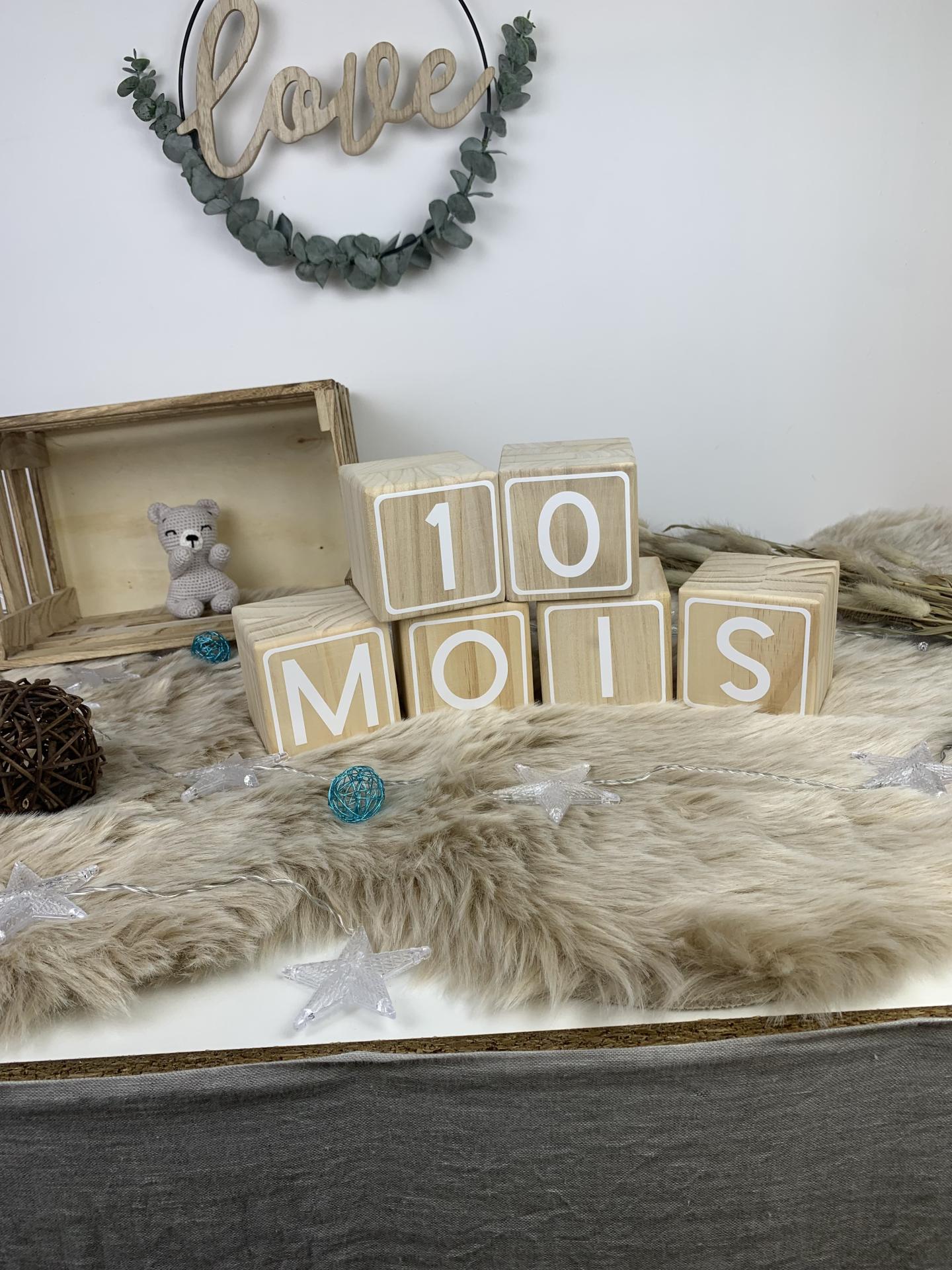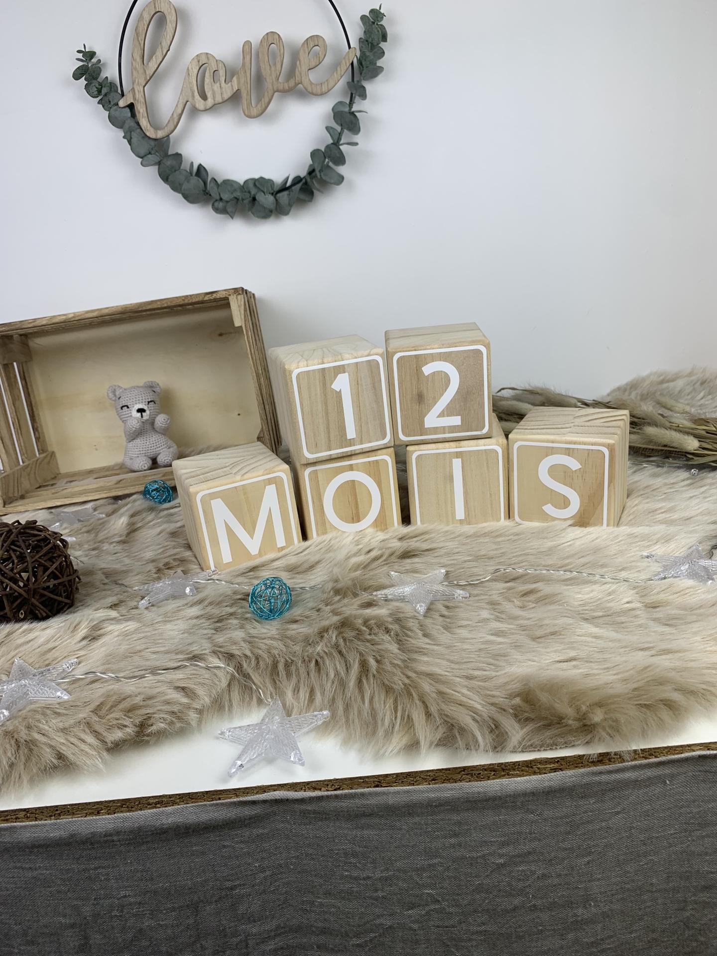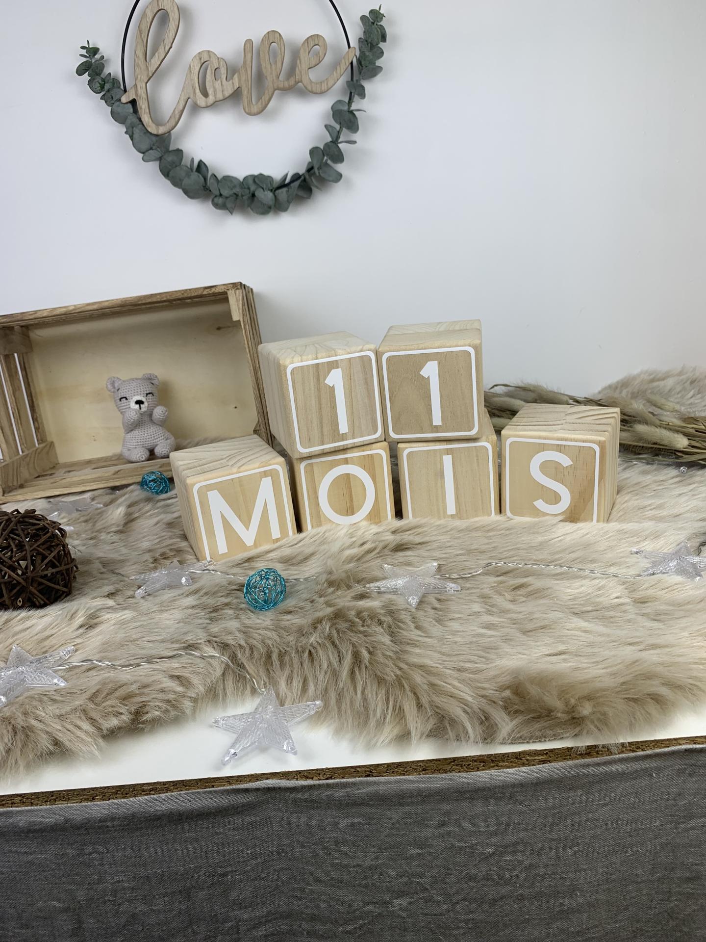 Nos cubes en bois naturel personnalisé par des chiffre blancs vous permettrons de réaliser tous les mois la photo des moisanniversaire des bébés.