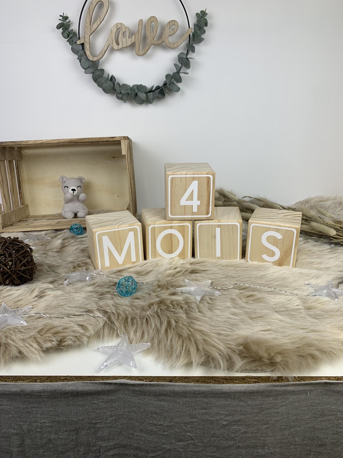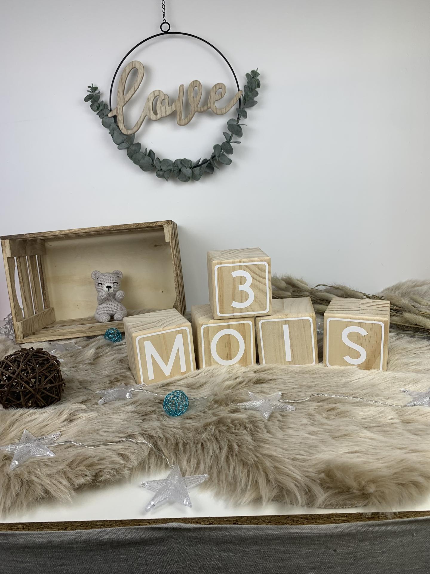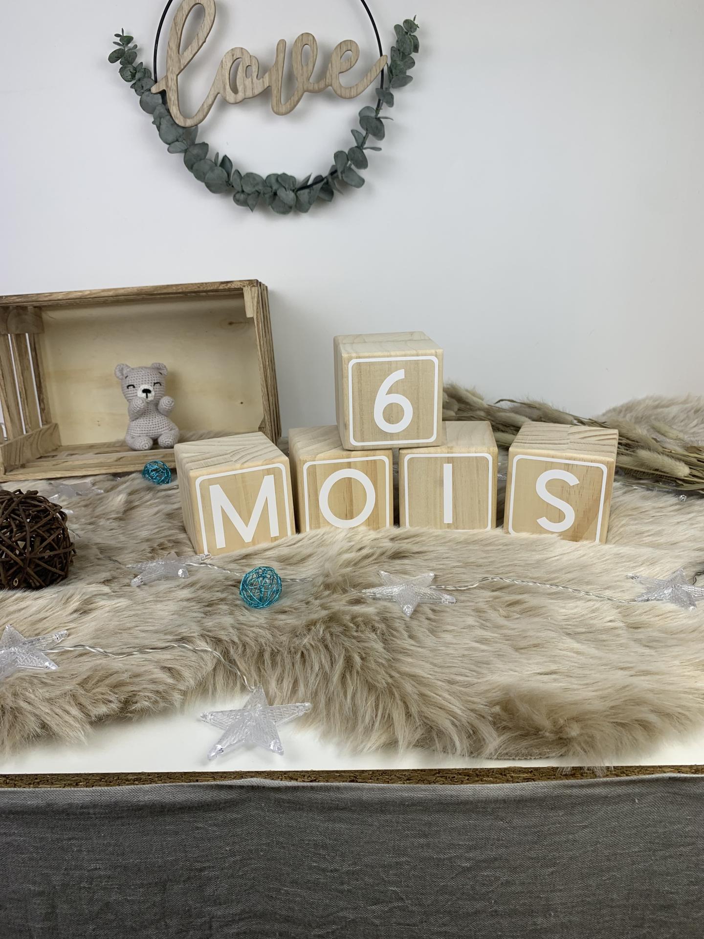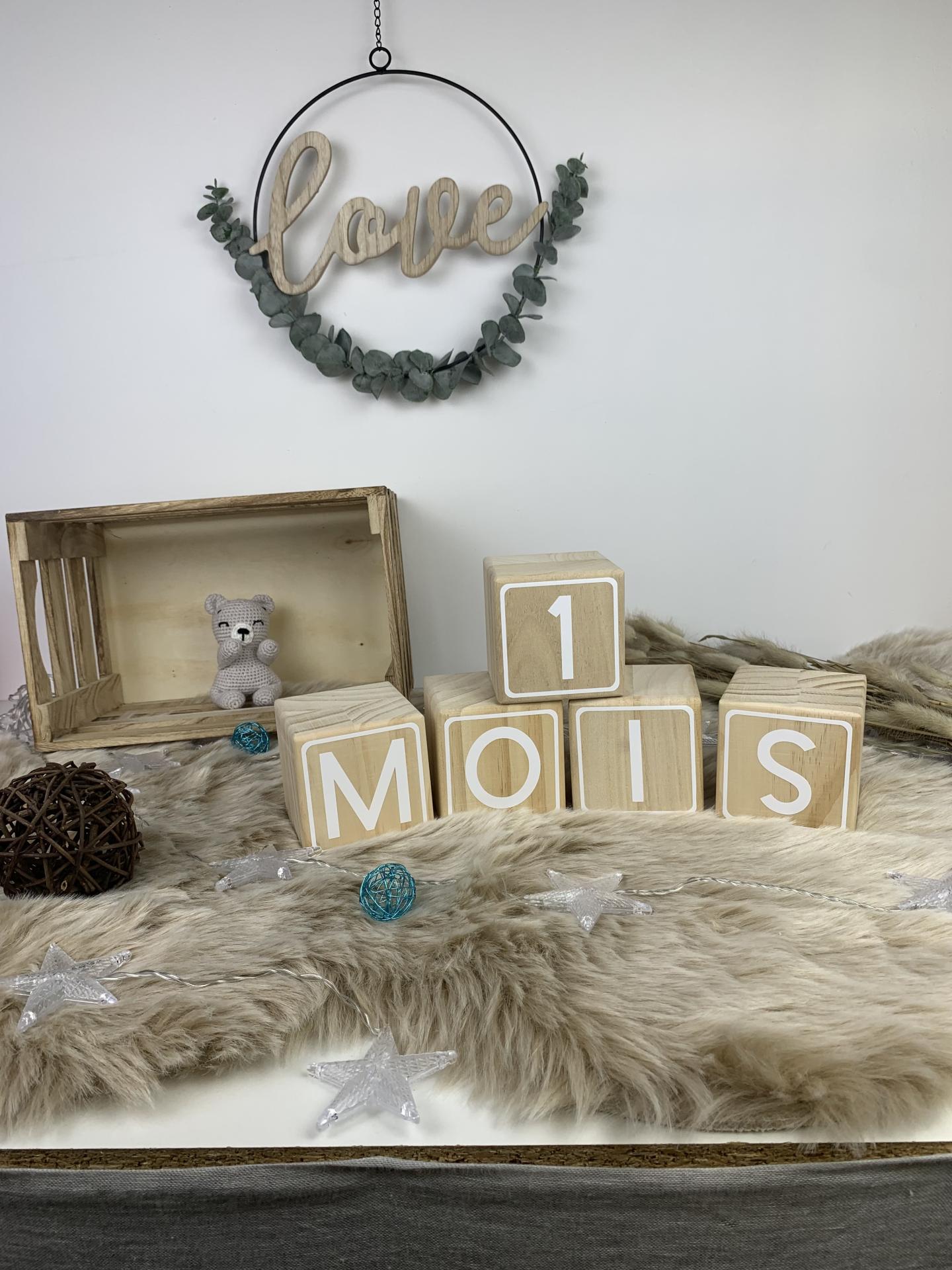 Nos cubes en bois naturel personnalisé par des chiffre blancs vous permettrons de réaliser tous les mois la photo des moisanniversaire des bébés.